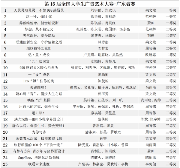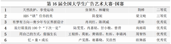 据悉,全国大学生广告艺术大赛由教育部高等教育司指导,中国高等教育学会、教育部高等学校新闻传播学类专业教学指导委员会共同主办。大赛作品分为平面类、视频类、动画类、互动类、广播类、策划案类、文案类、UI类、公益类等大类,是迄今为止全国规模大、覆盖高等院校广、参与师生人数多、作品水准高的国家级大学生赛事。第十六届全国大学生广告艺术大赛广东赛区共收到全省各学院推荐的19035组优秀参赛作品,共有127所参赛院校(229个院系)参赛。