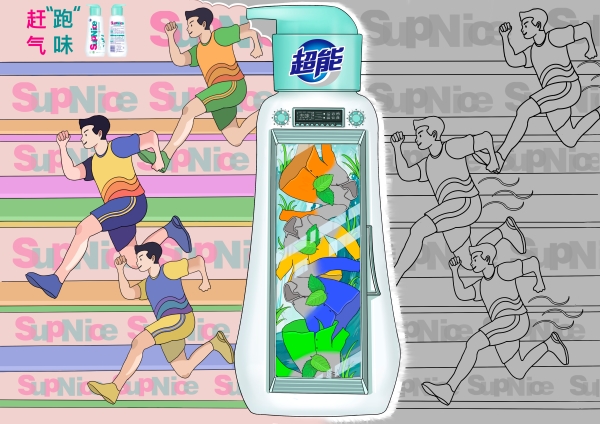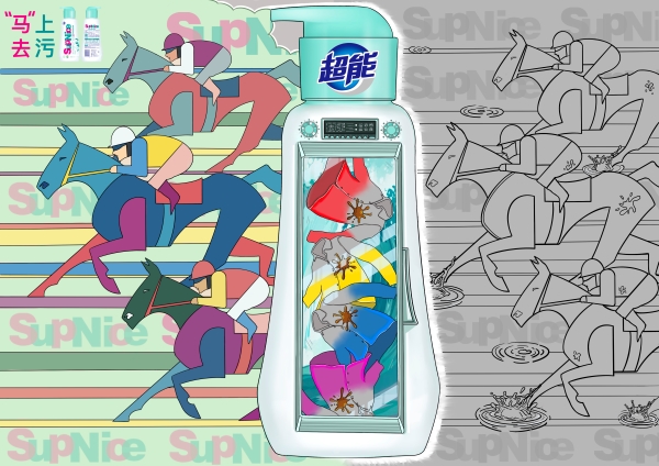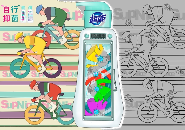 这组作品根据命题要求并围绕产品其功能进行创作,每张作品的画面分为两个板块,右边是无色板块,左边是彩色板块。无色板块体现的是刚刚运动完衣服上所残留的污渍,细菌和气味,通过中间的主体物——超能运动衣物洗衣液,对三个不同的运动场景进行清洗过滤,从而得到左边彩色板块,象征着经过超能运动衣物洗衣液的清洗变得干净、多彩、有活力。