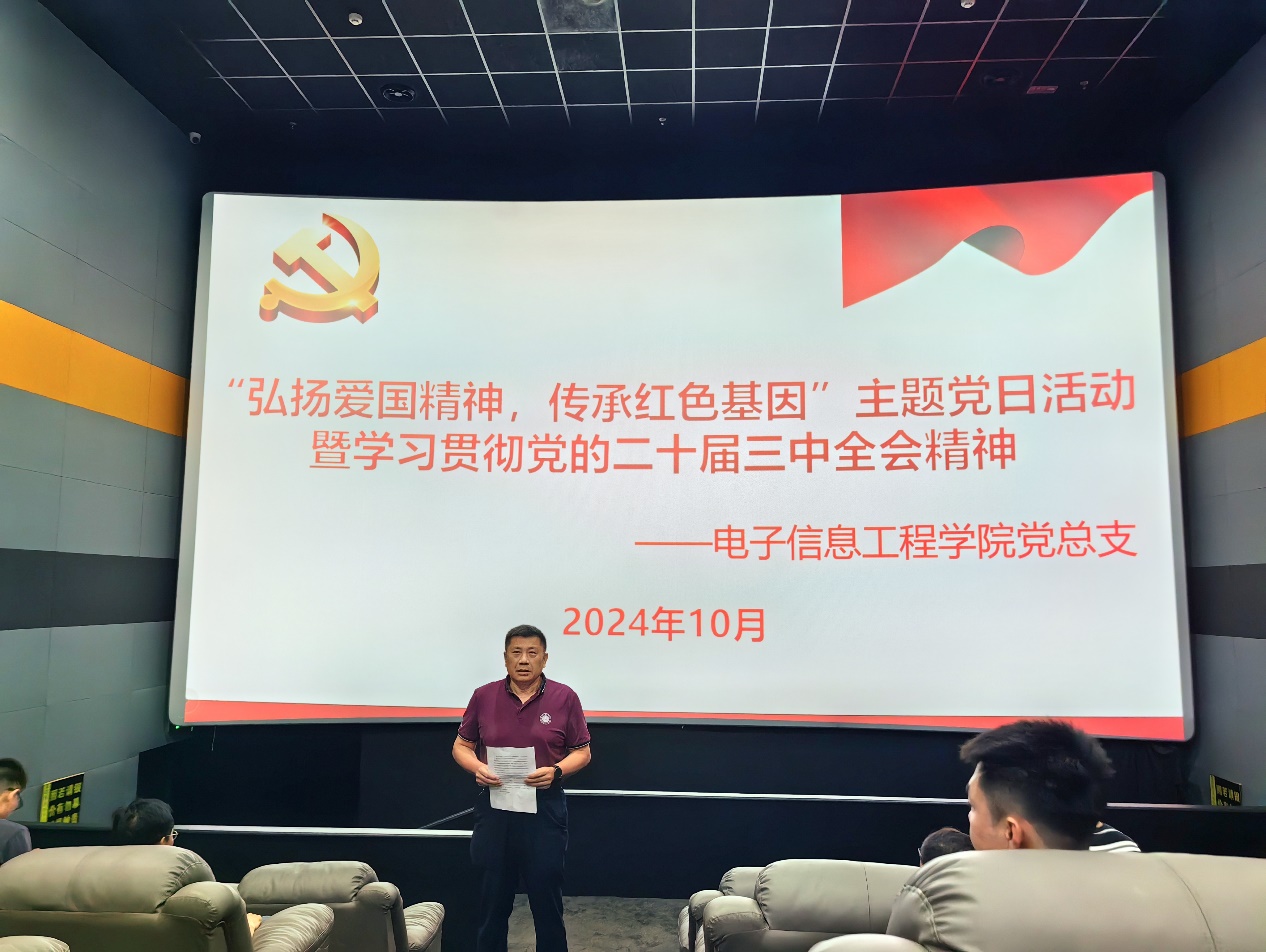 本网讯(记者 黄俊萌)为深入学习贯彻党的二十届三中全会精神,提高党员的责任感、使命感,10月11日,电子信息工程学院党总支开展“弘扬爱国精神,传承红色基因”主题党日活动暨学习贯彻党的二十届三中全会精神,组织支部党员观看爱国主义教育电影《志愿军:存亡之战》。