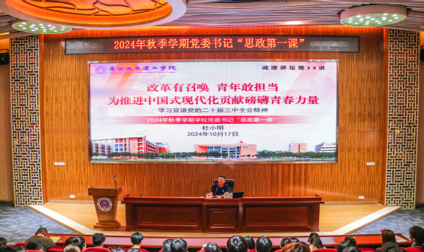 本网讯(记者 许晗星)10月17日晚,学校党委书记杜小明在行政楼703会议室,以“改革有召唤 青年敢担当 为推进中国式现代化贡献磅礴青春力量”为题,为2024级班团干部讲授思政课,这也是我校诚理讲坛第38讲。
