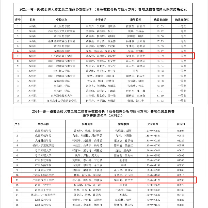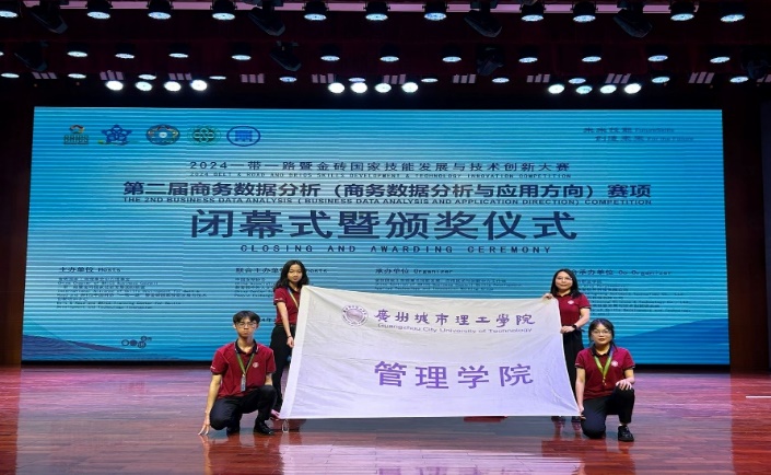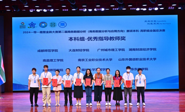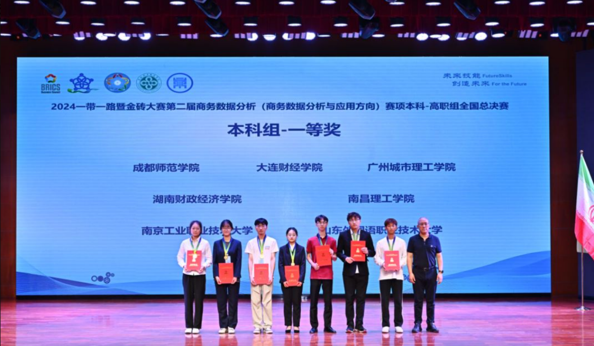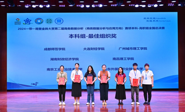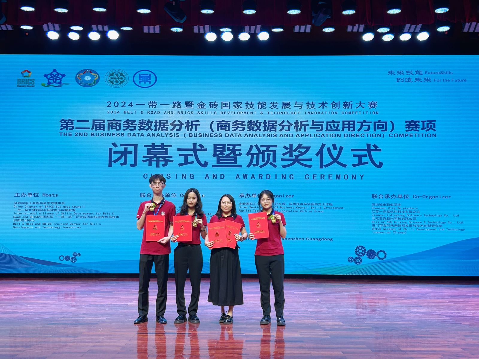 本网讯(记者 陈思绮 郭晓敏 梁丽丽)10月19日至20日,2024“一带一路”暨金砖国家技能发展与技术创新大赛第二届商务数据分析(商务数据分析与应用方向)赛项全国总决赛在深圳城市职业学院圆满落幕。我校管理学院工商管理专业的陈思绮、郭晓敏,大数据管理与应用专业的钟石祥组成的队伍在梁丽丽和官伟龙老师指导下,最终斩获全国一等奖。我校获本科组-最佳组织奖,指导老师获本科组-优秀指导教师。