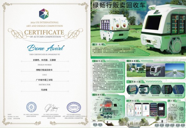 此次赛事设有金奖、银奖、铜奖、优秀奖及入围奖,奖项比例分别为金奖10%,银奖20%,铜奖30%。我校四项获奖作品均由邓道锋老师指导。《绿畅行贩卖回收车》由2021级工业设计专业史春艳主创,林思鹏与王麒雄协作完成。该作品是一款为户外开放性平原地区设计的贩卖回收一体车,旨在通过智能环保设计为游客提供便捷、绿色的购物与回收体验。回收车集贩卖、回收、自动补货及智能管理于一体,在减少人力成本的同时,提高运营效率,推动资源循环利用,展现景区的绿色生态形象。