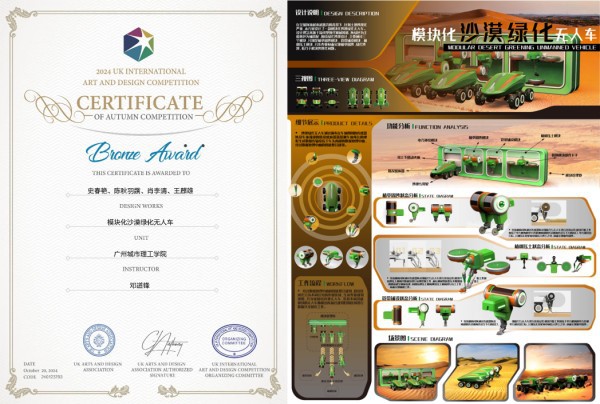《模块化沙漠绿化无人车》由史春艳、陈秋羽露、肖李清共同设计,王麒雄协作完成。该作品针对全球土地沙漠化问题设计,采用现代机械风格,以绿色为主色调,通过三个模块实现植草固沙、绿化沙漠的目标。该无人车旨在应对沙漠化环境问题,推动生态修复与可持续发展。