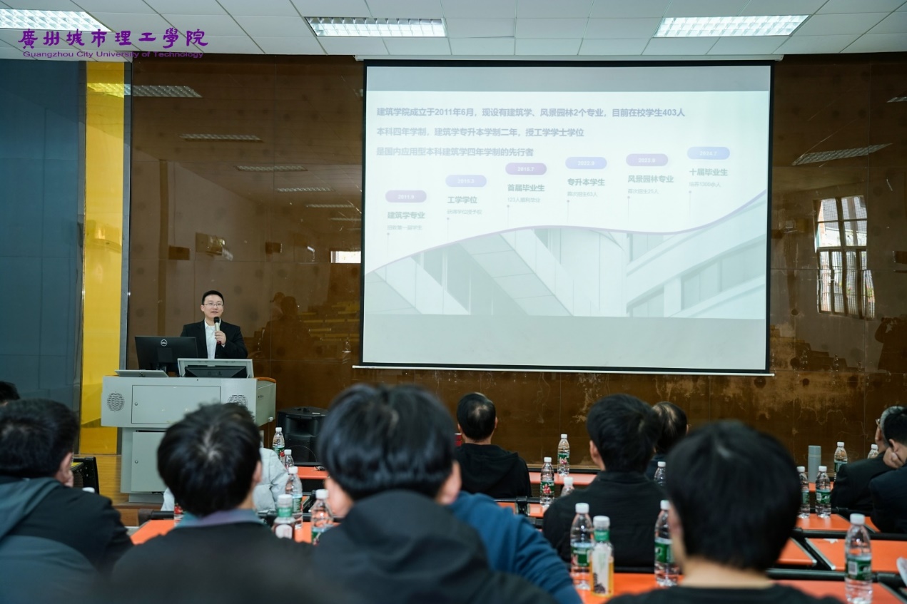 陈磊向校友们汇报建筑学院办学发展情况。他表示,办学以来,学院立足广东,根据粤港澳大湾区发展对建筑行业人才的需求,坚持“党建引领、体系设计、融合实践、赛展练创育人”等工作举措,培养出基本功扎实、动手能力强、职业道德良好的建筑类高素质应用型人才。他希望通过本次校友活动,更好地促进学院与校友之间的信息交流、资源共享,共同推动学院的发展。