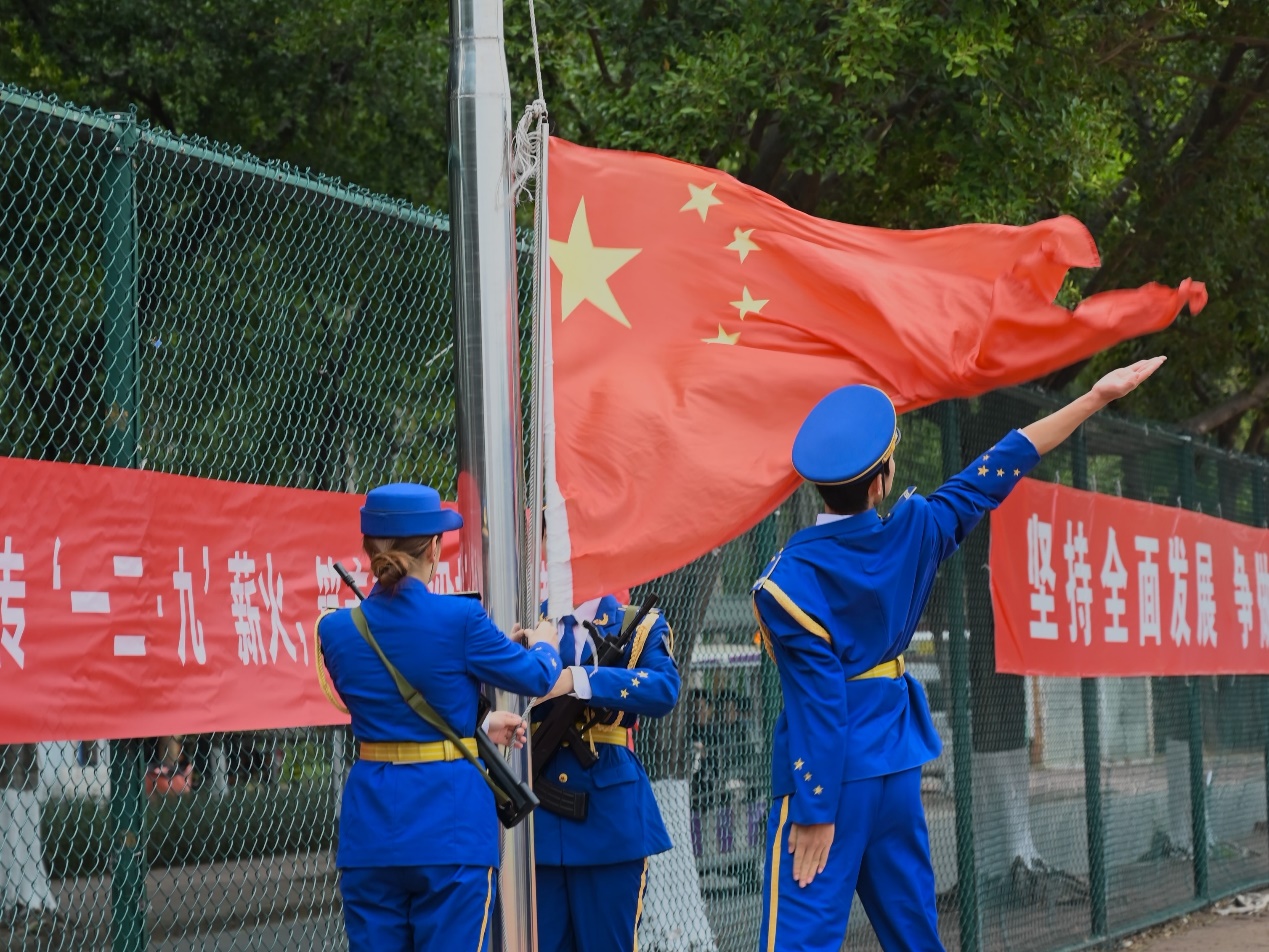 早上7点50分,国旗护卫队昂首挺胸,目光坚定,迈着铿锵有力的步伐护送五星国旗来到升旗台前。随着激昂的国歌响起,全体师生以饱满的精神状态齐唱国歌、注视着国旗冉冉升起。