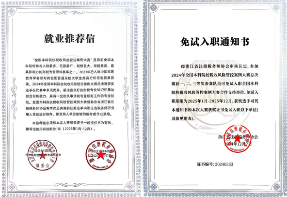 同时,参赛的三名同学均获得由浙江省注册税务师协会审核认定的免试入职通知书和就业推荐信,为同学未来的职业发展奠定了坚实基础。