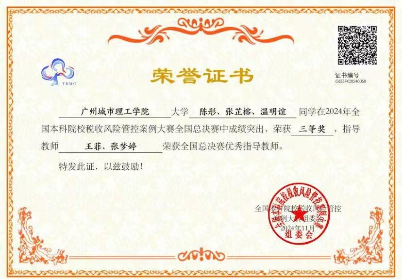 我校参赛队伍由管理学院2022级会计学专业的陈彤、温明谊、张芷榕同学组成,在王菲、张梦婷两位老师的指导下,参赛团队深入剖析真实企业案例与数据,全面审视企业连续经营背景下的税务风险,精准把握纳税流程,有效识别财务信息中的税务管控问题。最终凭借扎实的专业知识、敏锐的分析能力和出色的团队合作精神,获得全国总决赛三等奖。