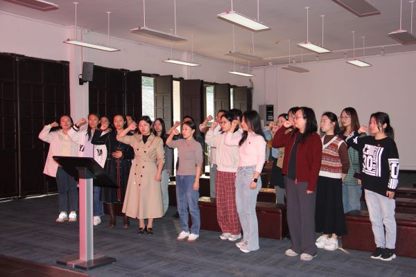 参观完毕,教工第三党支部书记邢莹莹带领党员在党员活动室里重温入党誓词。全体党员肃立,面对鲜红的党旗紧握右拳。在铿锵的誓词中,党员们再次接受党性的洗礼,叩问初心、守护初心,牢记使命。