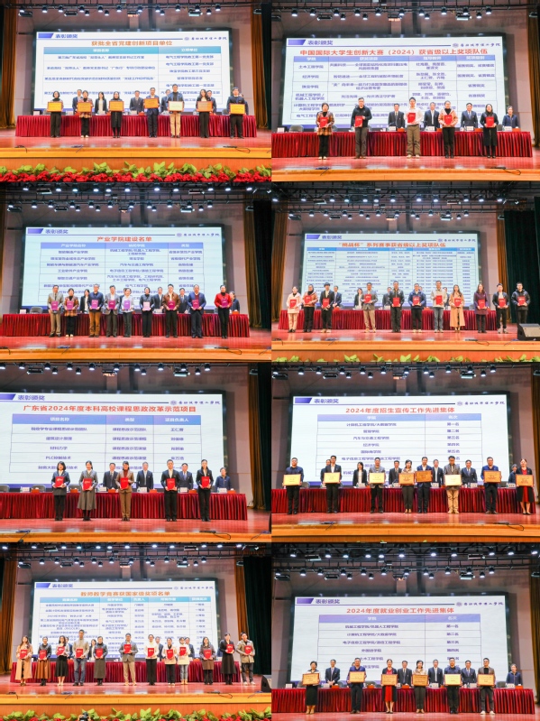 大会现场,对省级党建创新项目立项建设单位、产业学院、广东省2024年度本科高校课程思政改革示范项目、教师教学竞赛(省赛二等奖以上)、中国国际大学生创新创业大赛(省级以上奖项)、“挑战杯”系列赛事(省赛以上奖项)、2024年度招生宣传工作先进集体、2024年度就业创业工作先进集体等获奖单位及个人进行了表彰颁奖。