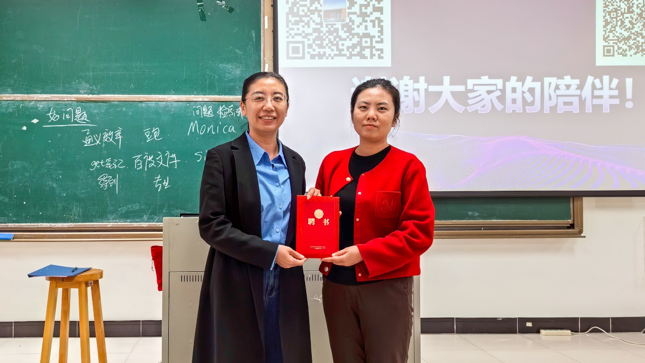讲座最后,郭培虹为苑苗苗颁发 “智识领航导师团”成员聘书。“智识领航导师团”是图书馆为丰富校园文化生活,推动第二课堂建设,特邀校内老师组成。未来,图书馆将继续开展相关讲座培训与推广活动,推动前沿技术与教育教学深度融合,为学生成长成才搭建更广阔平台。