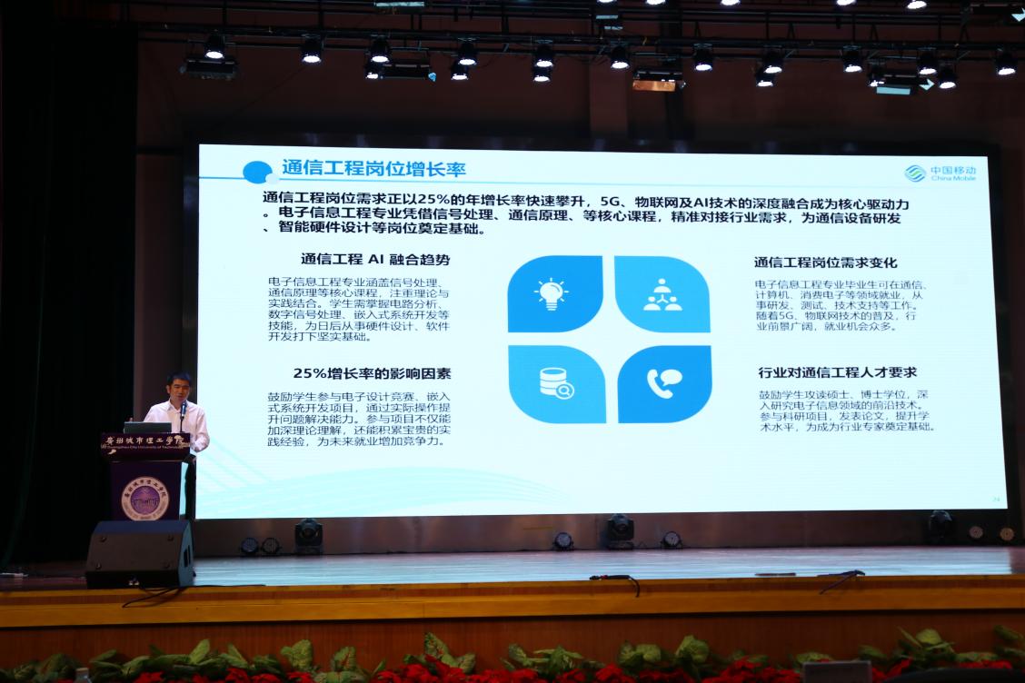 曾令创以“勇立潮头敢为先,乘风破浪正当时”为主题进行了讲座。本次讲座围绕AI科技变革中移动的角色、中国移动人工智能体系建设情况、移动AI布局中的角色与机遇、电子信息类专业大学生的机遇、AI时代人才的核心能力与规划发展等5个方面展开。他结合自身经历与案例,引导同学们了解中国移动的战略布局、人工智能时代的发展趋势以及作为新时代青年所需要具备的专业素质。互动环节中,他对大家在专业学习、未来职业方向的疑惑做出耐心解答,同时也鼓励同学们积极参加科技创新比赛,增强自己对新兴技术敏感度。