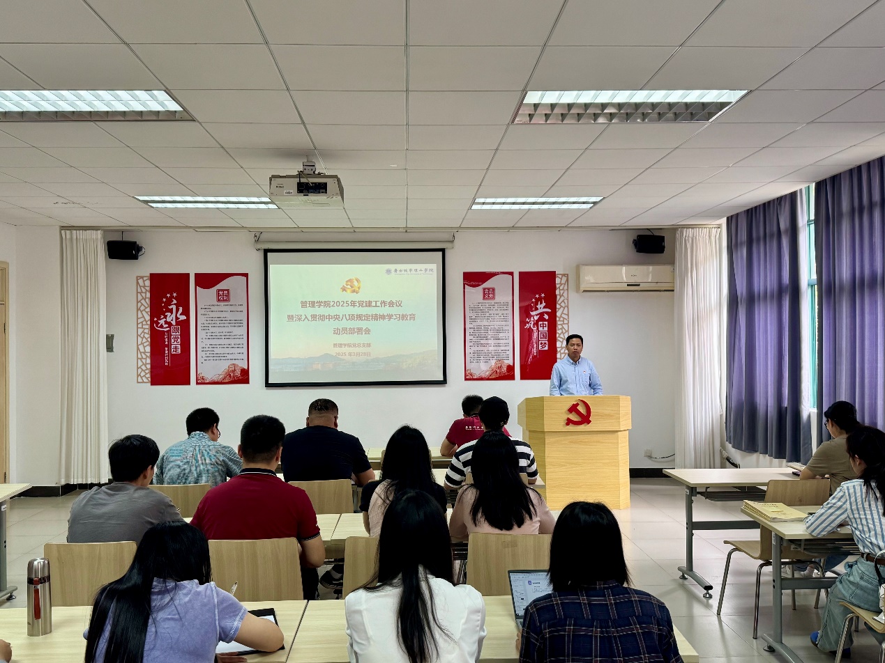 本网讯(记者 邓碧聪)为深入贯彻中央八项规定精神学习教育,传达学校党委工作部署,扎实推进学院党建工作,3月28日中午,管理学院党总支在A8-203会议室召开2025年党建工作会议暨中央八项规定精神学习教育部署会。会议由学院书记李大章主持,学院副书记戴杰、总支委员,各党支部书记、副书记参加会议。