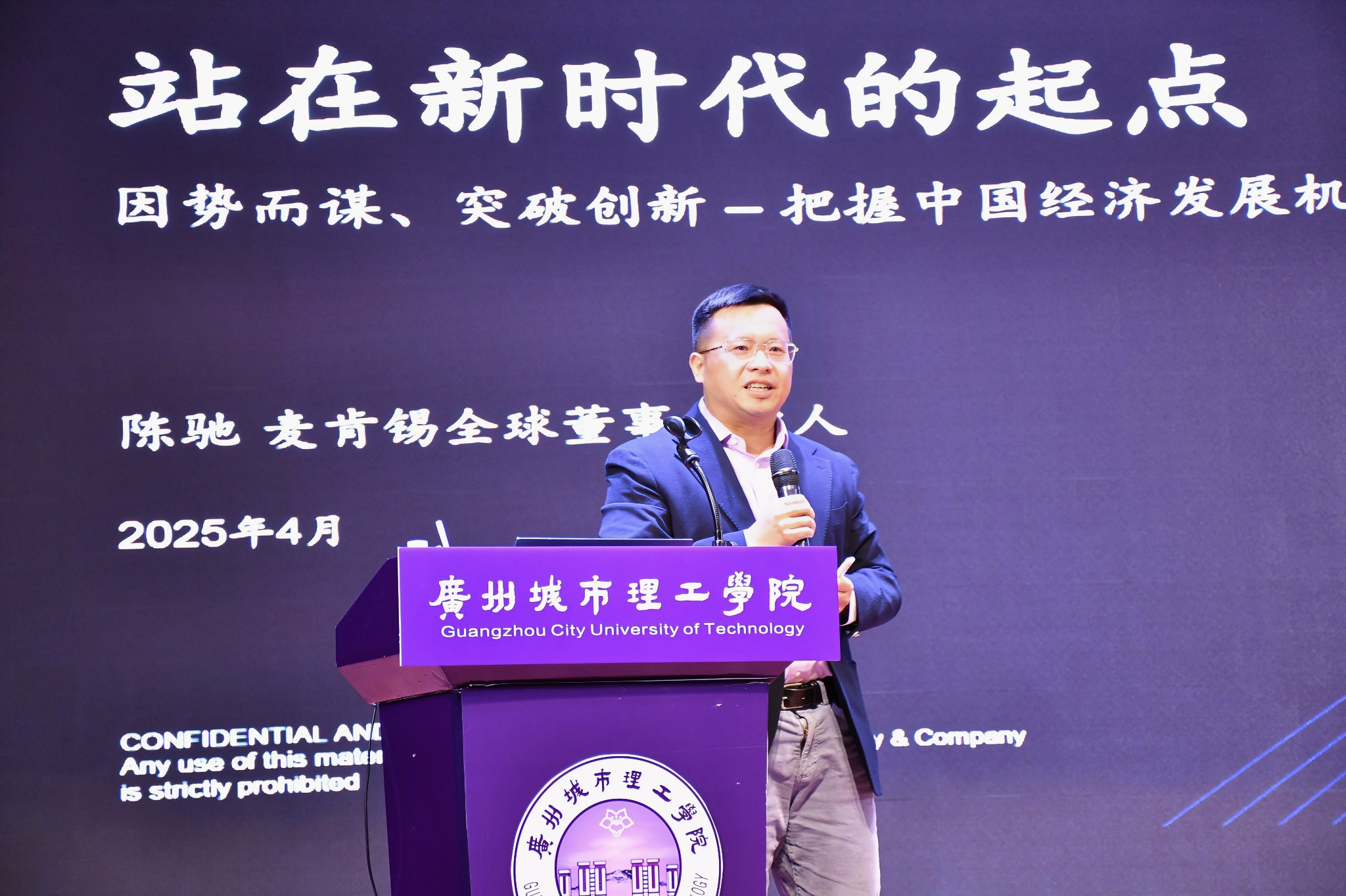 讲座开场,陈驰以“因势而谋、突破创新——把握中国经济发展机遇”为主题展开分享。他指出,当前世界格局正在发生深刻调整,中国凭借城市化推进、中产群体的消费潜力以及科技领域的突破,展现出独特发展机遇。企业既要抓住规模扩张和科技创新的双重优势,也要在复杂环境中建立灵活应对变化的战略能力。