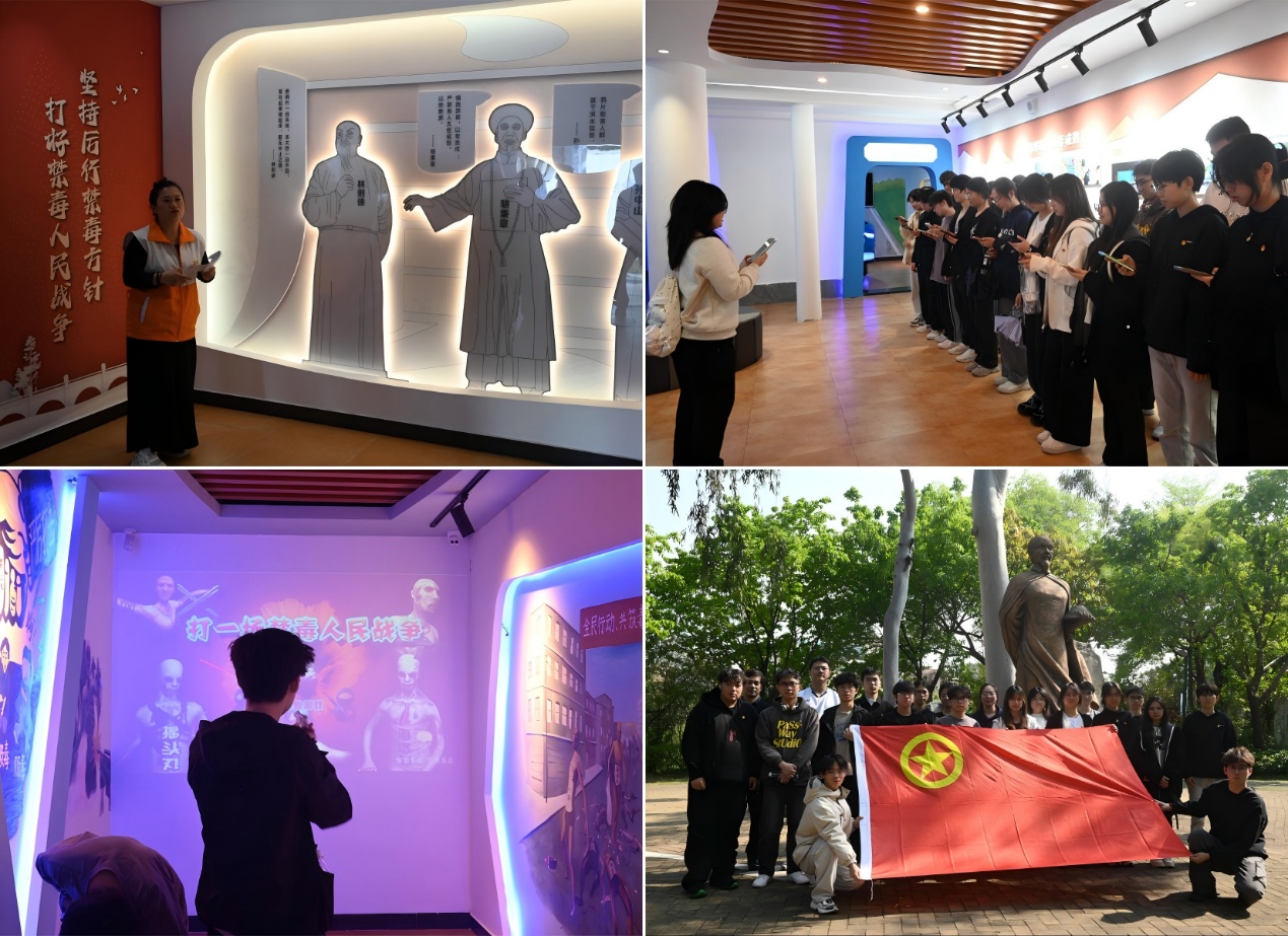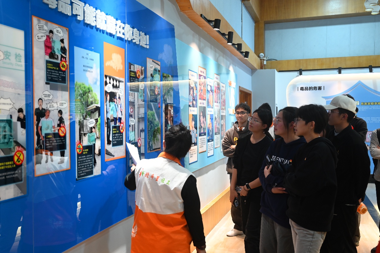 随后,师生一行走进花都禁毒教育基地,由基地工作人员及志愿者带领参观学习禁毒主题展。主题展包括三大板块内容:第一板块通过翔实数据展示广东、广州及花都地区的毒情,第二板块以真实案例剖析吸毒者的沉痛经历,第三板块系统讲解毒品来源、吸毒工具、禁毒历史等。经过系统地参观学习,同学们认识到毒品危害的同时,还学会了防毒“五连招”以及拒毒“十式”。团员青年在现场还体验了AR体感灭毒品、VR防毒、互动击杀毒魔等游戏,参观禁毒手抄报等原创作品,沉浸式的学习让大家深刻认识到毒品对个人、家庭及社会的危害,更加坚定拒毒防毒的决心。