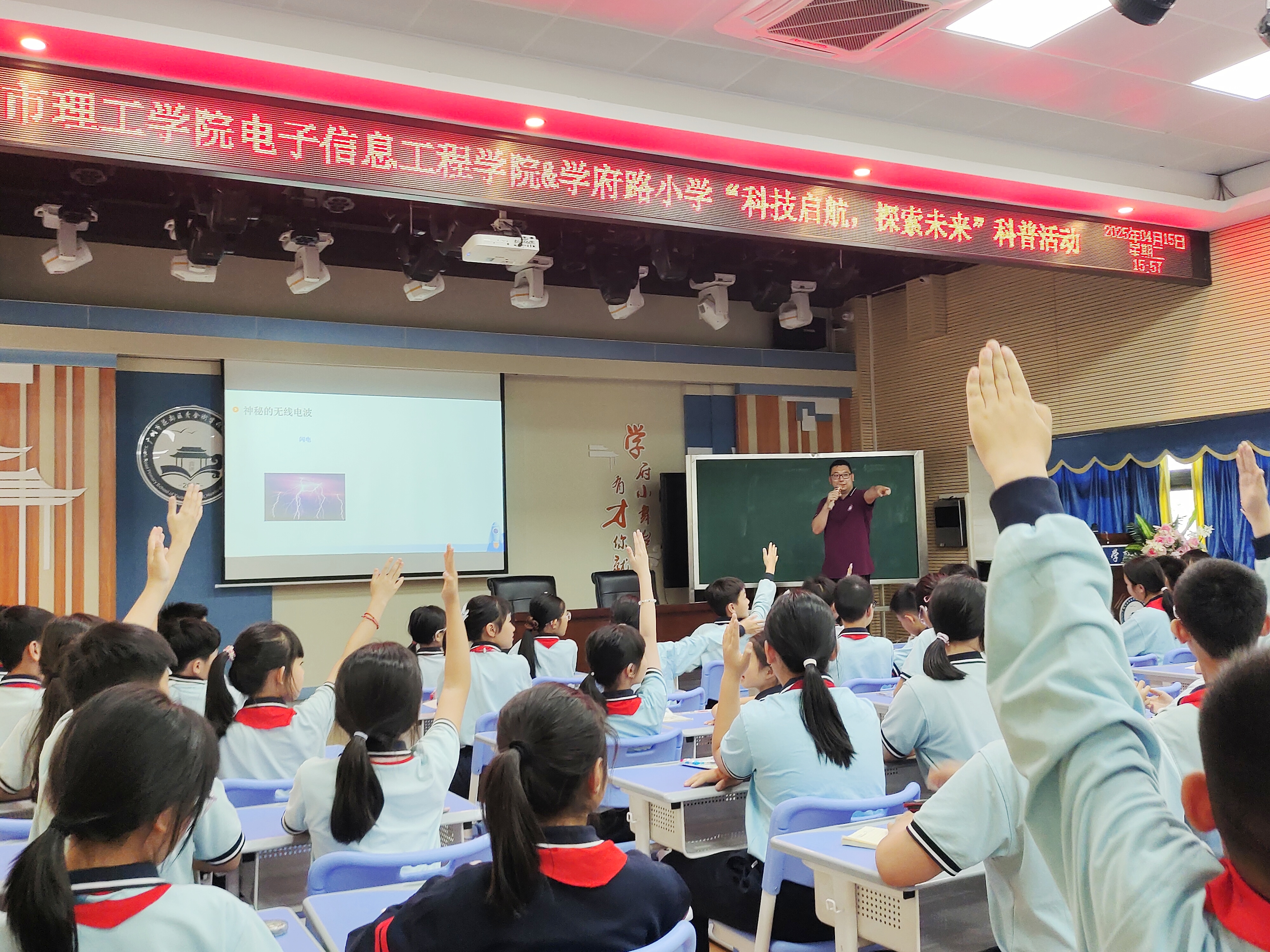 签约仪式结束后,在学府路小学多功能厅,我校无线电测向队指导教师张亦勋为五年级的学生带来了一场无线电波科普课堂。他以“看不见的空中信使”为切入点,通过动画演示、摩尔斯电码互动游戏和简易测向仪实操,诠释了无线电波的产生、传播与应用原理。课堂特别设置“科学盲盒”问答环节,学生们争相参与讨论。