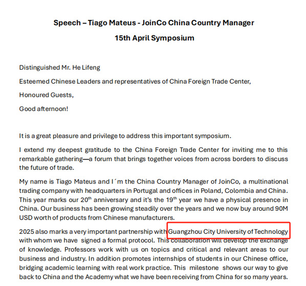 本网讯(记者 黄凤娟)4月18日,在第137届中国进出口商品交易会(广交会)如火如荼举办之际,国际商学院收到来自合作企业——葡萄牙跨国企业JOINCO公司中国区负责人Mr.Tiago Mateus的邮件,其中传递的消息令人振奋:4月15日,Tiago Mateus在广交会调研座谈会上,向国家及省市相关领导做汇报,并在汇报中着重介绍了与我校的校企合作情况,得到了在场领导的肯定。