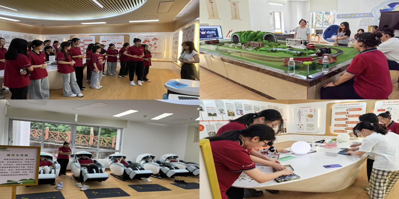 研学活动地点在广州市干部和人才健康管理中心心理健康科普基地,该科普基地是集心理科普、放松体验和科研研究为一体的全国首个心理科普专题场馆。场馆内有科普展示区、互动体验区、放松减压区以及身心冥想区。此次活动主要包括心理科普基地的互动体验和趣味团体辅导活动两部分。在心理科普场馆内,周沁怡科普老师首先向同学们介绍了心理健康的重要性,以及缓解心理健康的知识,然后引导同学们沉浸式体验场馆内的互动。在舒缓的音乐与轻柔的指导语下,同学们闭上双眼,双手放于腹部,调节呼吸,排除杂念,让自己的情绪得到舒缓。接着,同学们体验了“脑波火车”项目,通过火车前进的速度清晰地感受到自己身心的放松状态,越放松,火车就跑得越快。部分同学们亲身体验了“减压太空舱”舒缓按摩,在音乐的指引下,放松身体的各部位,达到释放压力的目的。此外,现场还提供绘画、解压玩具等辅助工具,让同学们在轻松氛围中舒缓情绪、体会心灵之美。