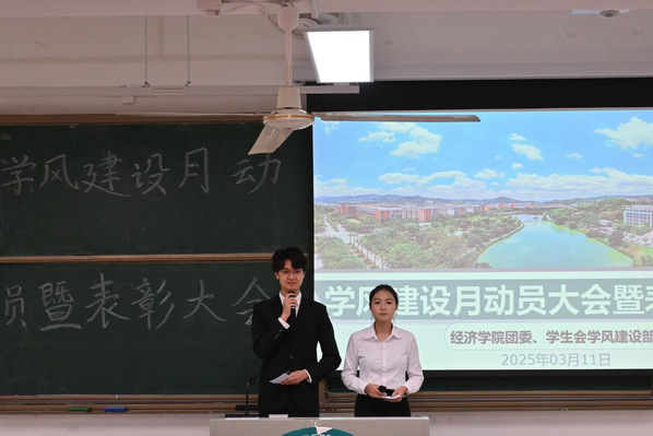 经济学院学风建设月动员大会暨表彰大会于3月11日在A5-101如期举行。经济学院院长王仁曾、党总支书记任远、学生工作办公室负责人张全胜以及各年级辅导员、班主任、各年级主要班委和学生代表共300余人参加。学院领导在会上深入阐述了学风建设对于学生成长成才、学院发展以及学科建设的重要意义,强调良好的学风是经济学院培养高素质经济人才的关键,是学院实现高质量发展的基石。会上,经济学院团委学风建设部负责人梁立佳详细介绍了学风建设月的活动安排,学生代表也分享了自己的学习心得,激励全体同学以更加饱满的热情投入到学习中。本次动员暨表彰大会的成功召开,为学风建设月的顺利开展奠定了坚实的基础,激发了同学们参与学风建设的积极性和主动性。