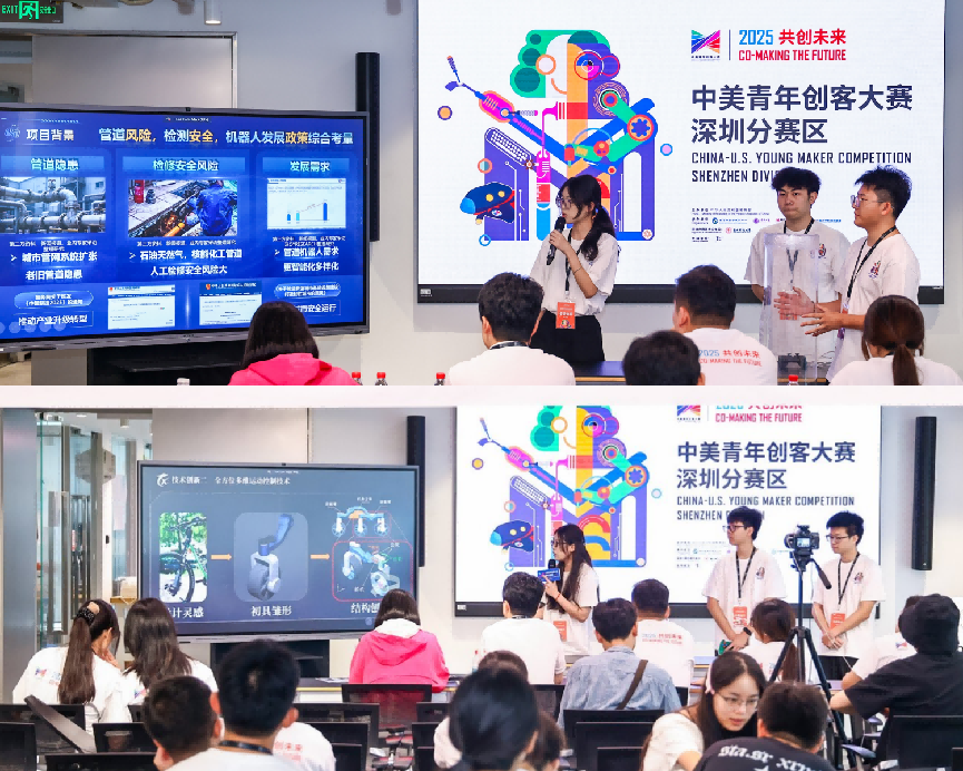 本网讯(记者 缪文南)6月22日,由南方科技大学承办的2025中美青年创客大赛(深圳)落下帷幕,我校电子信息工程/通信工程学院黄钰棋学生团队的“隧影智行-一种双摆式全向轮自主巡检管道机器人”和倪镒洭学生团队的“跃影哨兵—基于六轮摇臂底盘联动的侦察机器人”均斩获比赛二等奖。