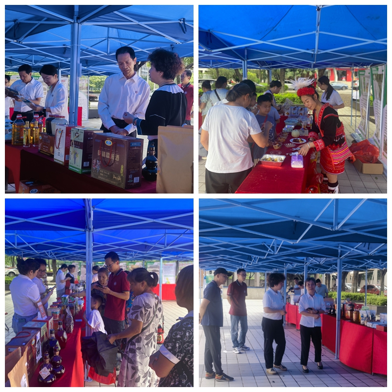 本网讯(记者 黄凤娟)为深入贯彻落实广东省“双百行动”,助力乡村振兴,6月21日,学校校工会、后勤处联合连南瑶族自治县总工会、县农业农村局、县供销社以及佛冈县供销社,在学校图书馆广场举办了连南农特产品鉴展销活动。校纪委书记、副校长、工会主席尚启超,副校长魏德敏及各部门工会主席等纷纷到场参加。