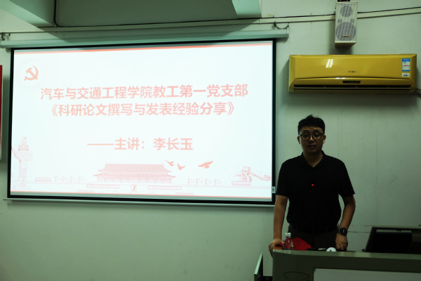 本网讯(记者 杨剑)为强化党建与业务能力提升双融双促,提升教职工科研能力和业务水平,6月20日,汽车与交通工程学院教工第一党支部组织开展主题党日活动。活动邀请学院党总支委员、教工党员李长玉教授作“科技论文撰写与发表经验分享”专题讲座,共同探索教师教学、科研深度融合的创新思路和方法。本次活动由党支部书记主持,支部全体教工党员及新教师共30余人参加。