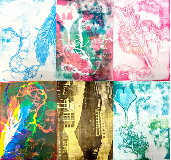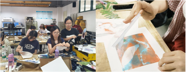 自由创作环节,同学们迫不及待地将所学所思付诸实践。构思阶段,大家打破思维定式,大胆融入综合材料与现代艺术理念,创意火花四溅。动手制作时,油墨滚动的韵律,凝胶材料独特的触感与延展性,都成为引导专注、释放压力的媒介。现场气氛热烈而宁静,同学们全情投入,在动手实践中体验到心流的忘我状态,暂时忘却了课业与生活的纷扰。彼此间的交流分享,也成为一种情感联结与支持。