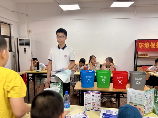 用电安全课堂上,实践团成员手持宣传册讲解后,邀请学生抢答生活用电知识。垃圾分类课上,成员们搬出了社区提供的四色迷你垃圾桶模型,让学生轮流上台投放印有电池、纸张、过夜饭菜等图例卡片,再对照宣传手册验证其操作准确性。其他安全课程则覆盖卫生教育、夏季流行病防范、防溺水等各个方面,通过开放性问答,引导学生熟识避险要点。