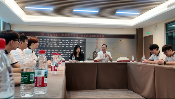 实践团首站抵达粤北1934年长征教育基地,与韶关红旅发展有限公司张玉华副总经理及教育基地负责人展开交流。张玉华分享了红军粤北战斗事迹。他讲述了基地整合红城林场、城群村为坑组等闲置资产,打造集红色教育、旅游实践等多功能于一体的国家文化公园先行示范区,结合粤北非遗竹编、革命时期电报机等特色研学项目案例,阐述红色文化赋能乡村振兴的实践路径。随后,他从职业发展角度鼓励大学生锤炼吃苦精神、树立正确价值观,为实践团后续调研提供了理论与实践启发。