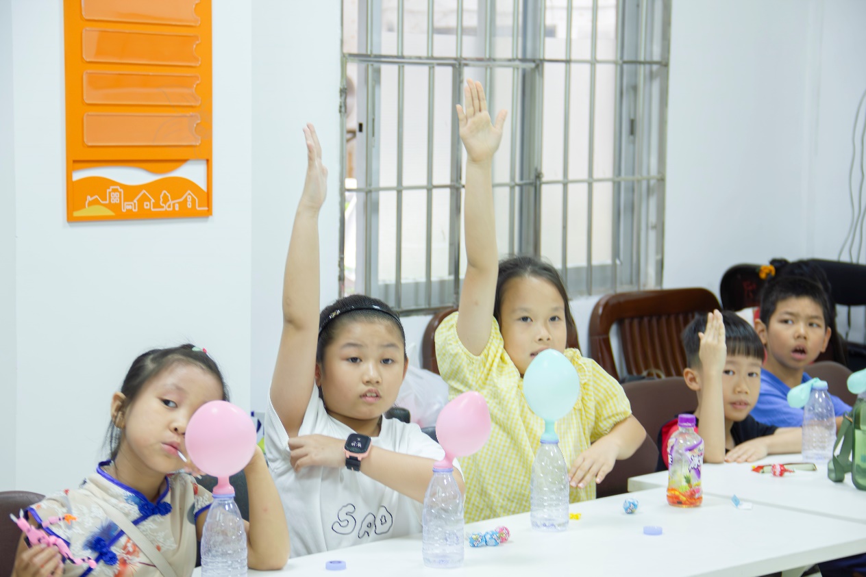 在物理实验板块中,“气球火箭”以动画演示导入,通过气球沿绳弹射的现象,用“气球像火箭一样‘喷气’后退”的比喻,阐释牛顿第三定律中的反作用力原理,分组开展“弹射距离比拼”以强化认知。此外,“瓶子吹气球”揭示化学反应生成二氧化碳的特性,“会跳舞的盐”展现声音振动的物理传导,“浮沉小玩偶”通过密度差演示浮力原理,让小朋友们形成多维度科学认知体系。