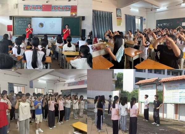 实践团将红色教育贯穿支教全过程,以多元形式厚植爱国情怀。在红色系列活动中,以红歌《没有共产党就没有新中国》《保卫黄河》、升旗仪式、鉴赏红色影视《长津湖之水门桥》等,通过不同形式与体验,激发同学们对民族复兴的坚定信念,让感恩之心与红色情怀相互交融、相得益彰。把丰富多样的活动带进课堂,引导孩子们深刻感悟爱国情怀,让红色信仰深深扎根于童心。实践团还将感恩教育融入其中,教授手势舞《听我说谢谢你》,孩子们用灵动的指尖舞动,生动演绎出“用红色基因传承,用爱心种子破土”的温暖意象,并自发向志愿者比出爱心,实现了红色传承与感恩教育的深度融合,让红色基因在孩子们心中生根发芽。