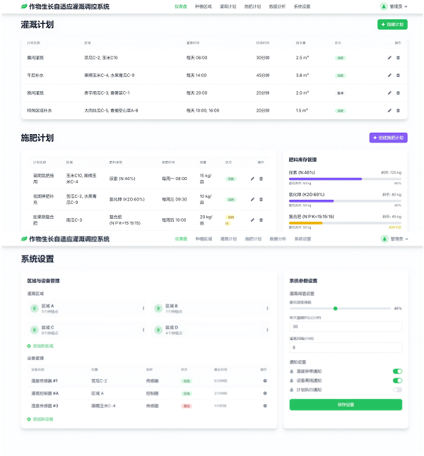 系统通过传感器实时采集土壤湿度、温度和气象数据,结合历史用水信息,精准刻画不同区域的环境特征,支持按需灌溉与多时段计划管控,覆盖晨间灌溉、午后补水等多种应用场景。系统还围绕作物生长周期制定施肥方案,适配不同肥料类型,并通过AI算法智能推荐养分配比,如玉米苗期增氮配磷钾、苦瓜花期提钾补磷等,实现“因时因需”精准调控。