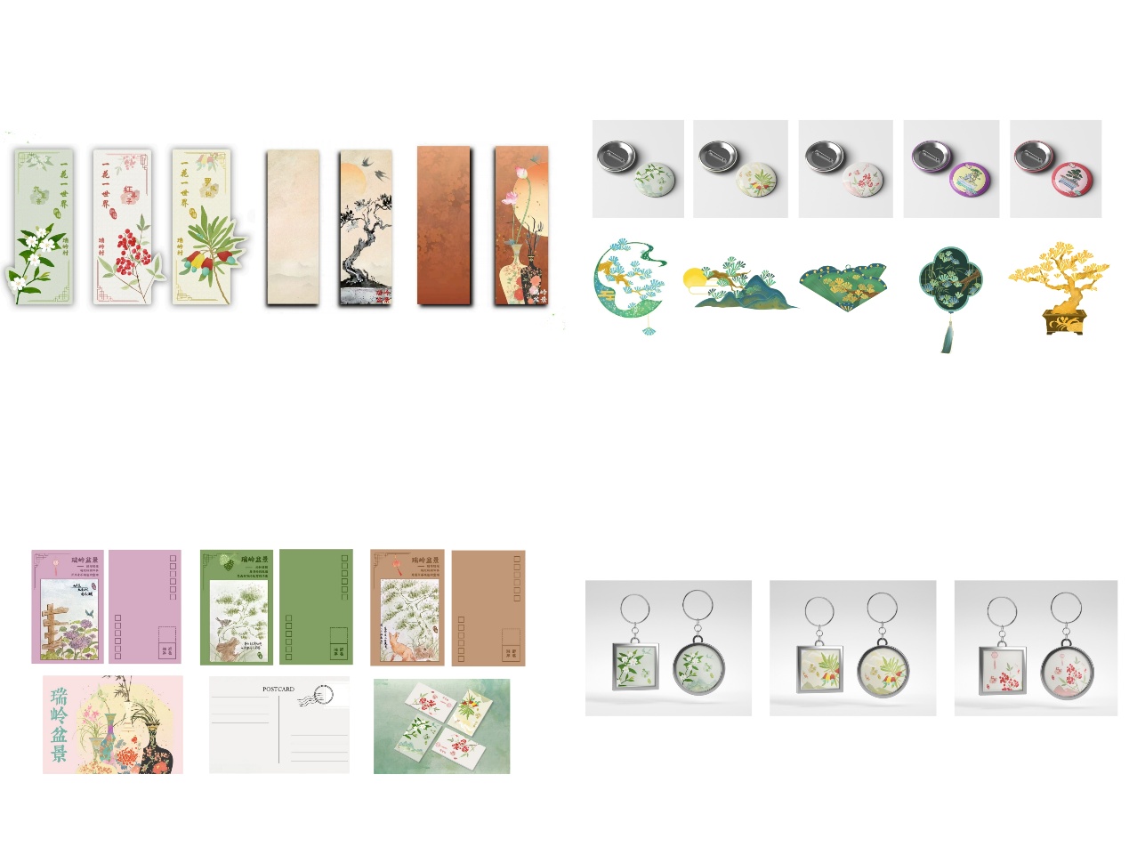 实践团根据瑞岭村的盆景特色、盆景元素,并结合地域文化特色进行创作,设计了独具特色的明信片、胸针、钥匙扣、书签及冰箱贴等文创产品,通过文创产品展现瑞岭村盆景的独特魅力。
