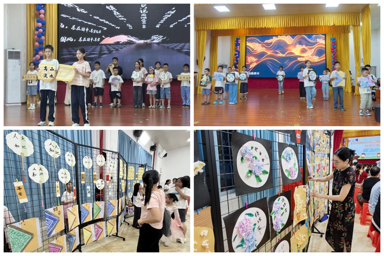 “创意作品秀”环节,书法班和美术班的学员们化身成小艺术家,在舞台上进行艺术展示。书法班展示的作品包括“高山流水”四字作品、“平安”书签和“天地人和”四字团扇。美术班的绘画作品有“海底世界”水彩画、四季风景画、融合瑶族元素的创意非遗蜡染等。非遗小课堂穿插其中,分别有剪纸、漆扇、植物拓印和扎染4种体验课。
