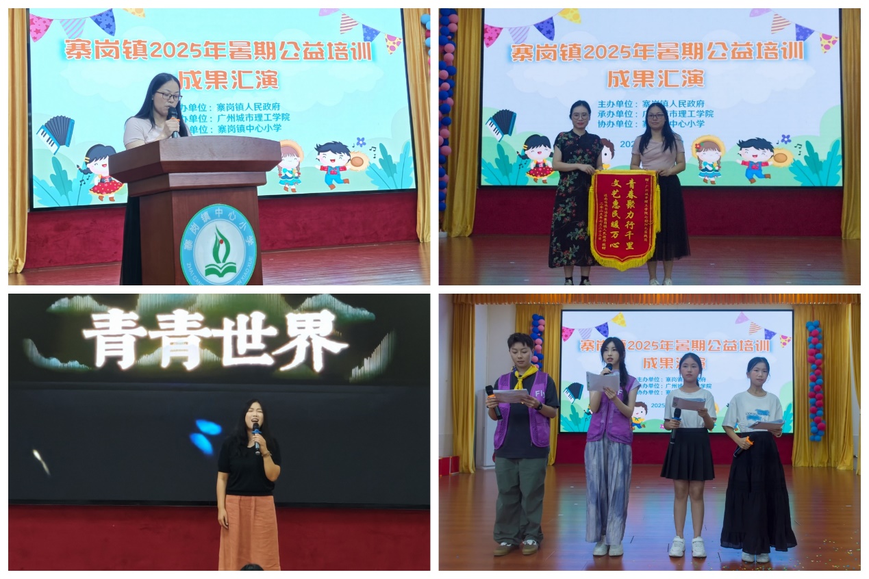 汇演当日,寨岗镇副镇长黄雪萍出席活动并发表致辞。她代表寨岗镇人民政府向马克思主义学院的师生团队致以诚挚的敬意,向七彩阳光实践团在这个夏天带来的七彩公益第二课堂致以诚挚的感谢。为助力培养德智体美劳全面发展的新时代好儿童,寨岗镇联合学校开展“七彩假期 筑梦未来”暑假公益课堂,为青少年提供书法、绘画、声乐、舞蹈、模特走秀等5个课程,帮助广大儿童度过一个思想有引领、安全有保障、健康有呵护、情感有抚慰的假期。她表示:“暑期公益培训为乡村孩子们搭建了展示自我的艺术舞台,让他们收获了自信与快乐。教育的意义不仅是知识的传递,更是兴趣与品格的培养。”随后,黄雪萍向七彩阳光实践团颁发锦旗,带队老师黎绮云代表上台领奖。