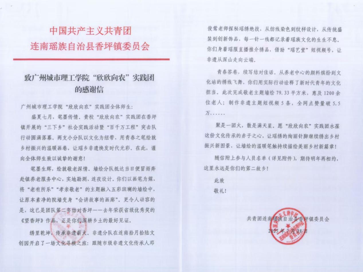 香坪镇团委充分肯定了实践团的各项成果,以感谢信的方式称赞团队“用青春之笔绘就乡村振兴的温暖画卷,让瑶乡非遗焕发时代光彩”。实践团成员在瑶族文化墙绘的执笔中、瑶绣传承的参与中、跨专业融合的协作中,让书本知识真真正正用到了实处,把社会责任实实在在转化为行动,充分展现了城理学子的青春担当。