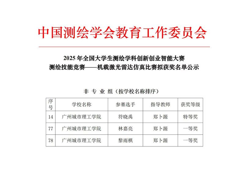 本讯网(记者 郑卜源8月4日,由中国测绘学会教育工作委员会主办,内蒙古科技大学、南方测绘集团协办2025年全国大学生测绘学科创新创业智能大赛圆满落幕。作为入选《全国普通高校大学生竞赛分析报告》竞赛目录的高水平赛事,此次大赛吸引了全国近400所高校的7000余名学子同台竞技。我校土木工程学院参赛队伍经过激烈比拼,最终在“机载激光雷达仿真比赛”子赛项中脱颖而出:符晓禹同学凭借精湛的技术与创新的方案斩获特等奖,黎雨棋、林嘉亮同学则以稳定的发挥摘得一等奖,展现了我校学子在测绘遥感领域的深厚积累与实践能力,彰显了学校竞赛育人的扎实成果与人才培养的硬核实力。