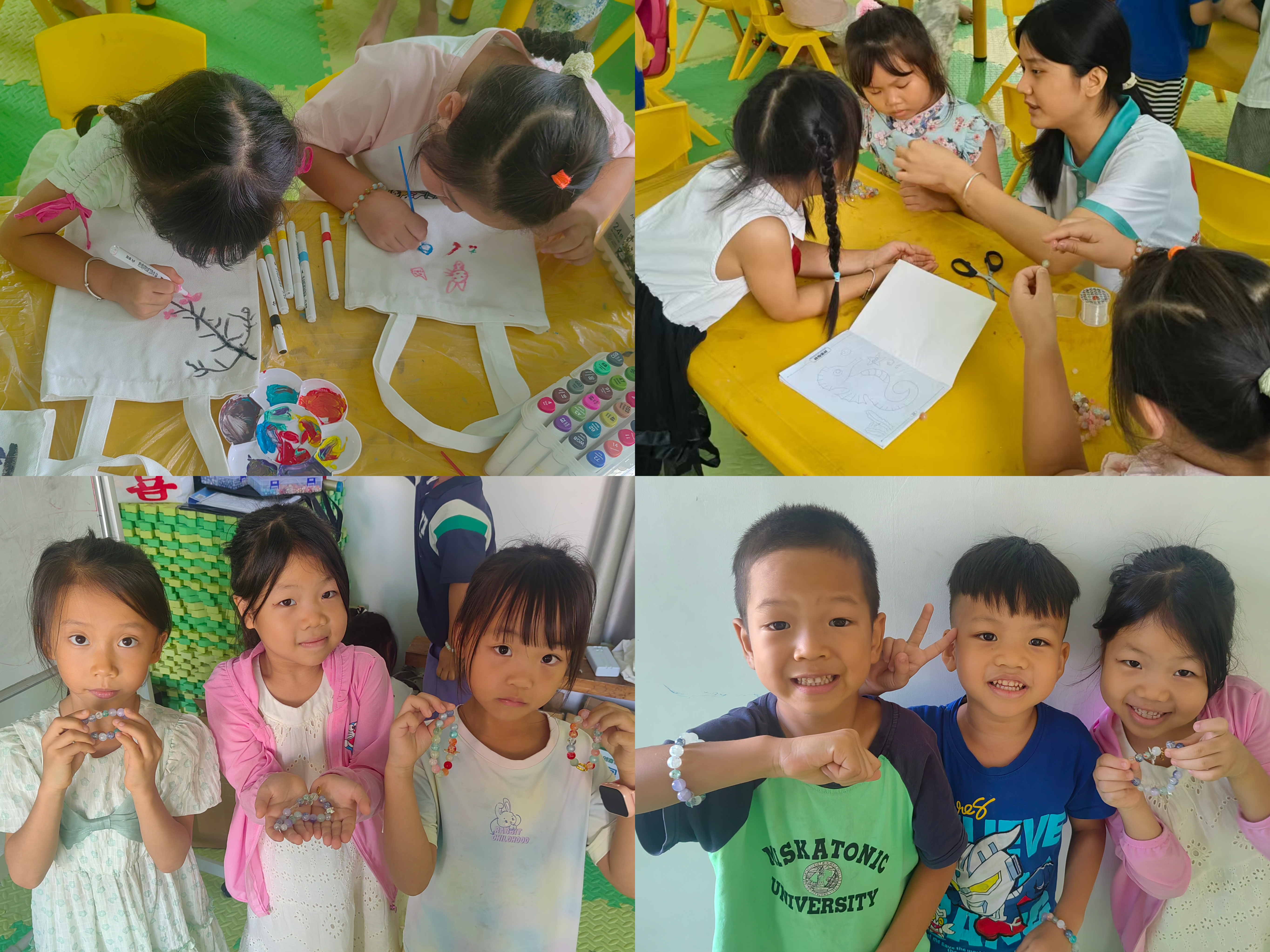 实践团结合当地青少年儿童的兴趣特点,开设了一系列手工艺术兴趣课堂。在成员们的引导下,小朋友用画笔在帆布袋上涂画,用双手串起绳线与珠子,打造独属于自己的DIY袋子与手链,每个作品都是独一无二的艺术品。通过这种趣味手工方式,培养他们的专注力、创造力与审美素养。