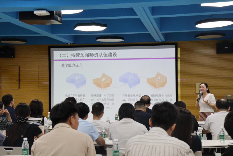 沈娜围绕新学期教学与科研工作思路作汇报。她表示,学院将持续推进课程建设与改革,加强师资队伍建设与教学质量监控。学科建设方面,沈娜介绍了“新能源与新型配电网现代产业学院”的建设进展与运作模式。她指出,本学期学院将重点推进广东省科研专项,积极筹备2025年能源科学与交叉学科国际学术会议。沈娜传达了苏成校长关于科研工作的讲话精神,鼓励教师横纵结合申报课题,提升科研能力。