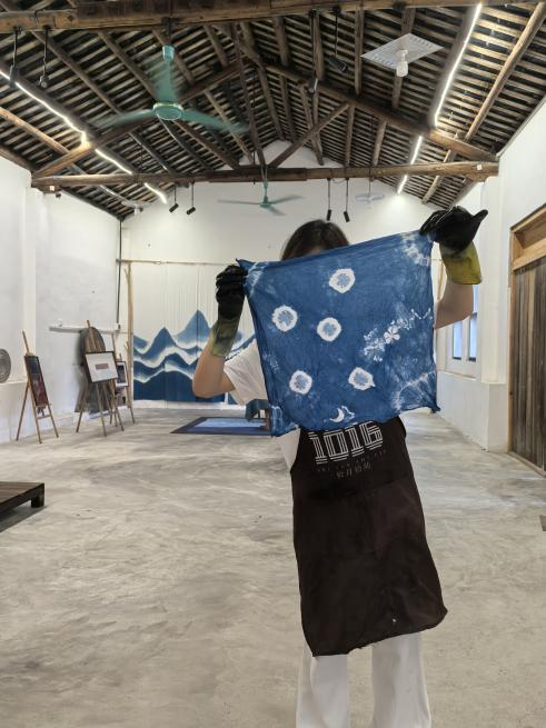 连南瑶族扎染工艺传承数百年,以“蓝白为主、自然晕染”为特色,从染料提取到成品晾晒需经十余道工序,每一件作品都是“自然与匠心的结合。”工坊负责人详细讲解扎染的历史渊源与工艺细节后,队员们亲身参与制作:从折叠布料、用棉线捆扎花纹,到将布料浸泡在天然蓝靛染料中,再到耐心等待染料渗透、解开棉线见证成品,每一个步骤都认真摸索。“原本以为扎染很简单,亲手做了才知道,每一个结的松紧、每一次浸泡的时间,都会影响最终的图案”,团队成员小罗拿着自己制作的扎染方巾感慨道,此次体验让她对非物质文化遗产有了更直观的理解。