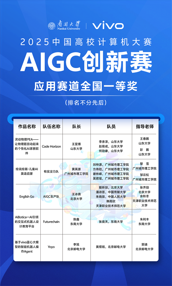 “中国高校计算机大赛”(China Collegiate Computing Contest,简称C4)由教育部高等学校计算机类专业教学指导委员会、教育部高等学校软件工程专业教学指导委员会、教育部高等学校大学计算机课程教学指导委员会、全国高等学校计算机教育研究会于2016年创办。第二届(2025年)“中国高校计算机大赛-AIGC创新赛”由南开大学与vivo公司联合承办,东莞滨海湾新区管理委员会协办。该竞赛面向全国高校在校学生,以vivo自研通用大模型矩阵为技术底座,助力AIGC应用创新和内容创作,携手青年开发者共同推动大模型前沿技术快速发展,实现AI普惠应用。本届竞赛共有来自全国多所高校的研究生、本科生及专科生同台竞技,竞争激烈。