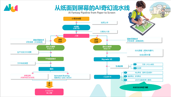 学院参赛团队通过运用蓝心大模型矩阵API,专为儿童、家长及教师量身打造了一款绘说绘画软件。该软件以vivo蓝心大模型作为“大脑中枢”,辅以妙笔生画模型进行背景渲染,将小朋友的涂鸦变成动起来的故事角色,帮助小朋友愉快地学英语。蓝心大模型作为核心引擎,通过专属Prompt模板精准定位“儿童助手”角色,采用“童趣”语言风格与幼儿互动,同时提炼关键词以供妙笔生画生成角色背景,并优化剧情文本,有效弥补了传统绘画工具互动性不足、语言学习缺乏真实情境的短板。借助Grounded-SAM-2技术,软件可快速分离手绘角色,再通过Animated Drawings实现角色动作绑定,Skyreels-V2引擎则负责编排生成英语情景动画,不仅有视觉高亮、语音跟读等功能,而且还支持智能更换背景,带来沉浸式教育体验。