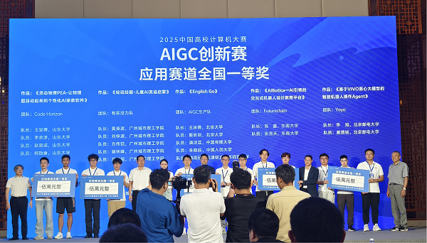 本网讯(记者 黎雪)8月25日,“2025中国高校计算机大赛-AIGC创新赛”应用赛道决赛答辩在东莞圆满落幕。决赛采用线下答辩形式,由来自全国八大赛区的高校教师与vivo公司专家组成的10人评审团共同评审。35支决赛队伍最终决出一等奖5队、二等奖10队、三等奖20队,并评选出蓝心设计奖1队及蓝心创新奖1队。计算机工程学院/大数据学院派出的学生队伍在本次竞赛中表现优异,与北京大学、北京邮电大学、南开大学、同济大学等高校同台竞技,最终荣获全国一等奖及蓝心设计奖,充分展现了我校学子扎实的AIGC技术基础与卓越的创新应用能力。