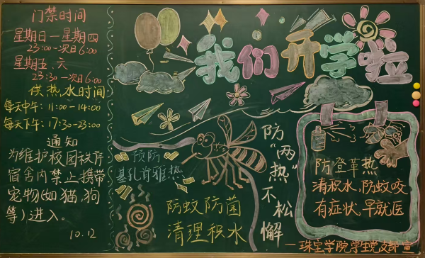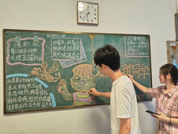 学院还通过多种形式持续推进防蚊防病宣传教育。8月28日,珠宝学院学生党支部在C9、C15宿舍楼下精心绘制了以“防蚊防病”为主题的黑板报,生动普及基孔肯雅热、登革热的传播途径、症状和预防措施,图文用“纱窗关、病毒远;驱蚊液、随身带”等简洁口诀,进一步增强同学们日常防蚊意识。