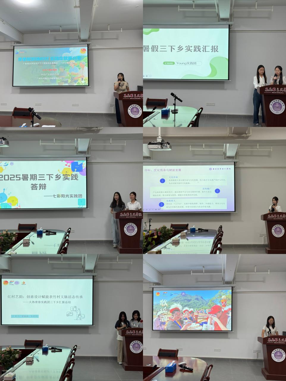 六支参与“三下乡”社会实践活动的团队按照抽签顺序依次上台展示和答辩。各团队围绕实践主题、过程与成果进行汇报,展现出当代青年大学生扎根基层、服务社会的青春风貌。