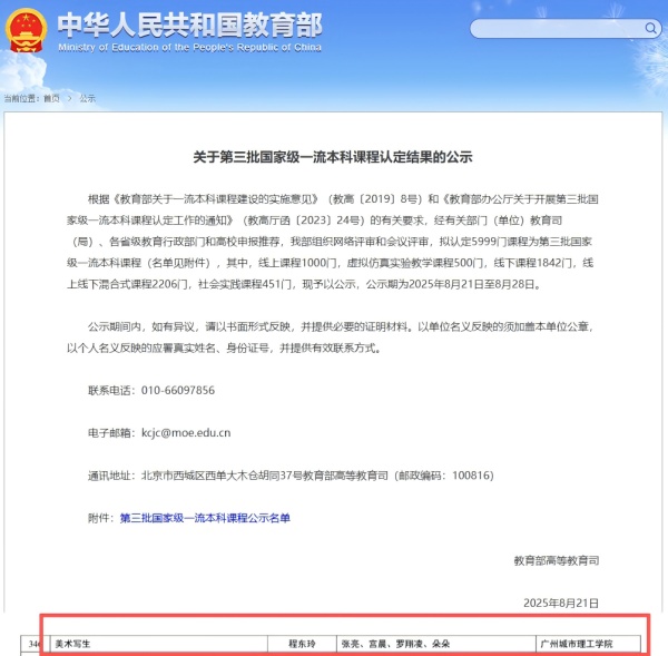 本网讯(记者 程东玲 冯慧雅)8月29日,教育部高等教育司关于第三批国家级一流本科课程认定结果公示结束,我校建筑学院程东玲副教授主持的《美术写生》课程入选国家级社会实践一流课程,标志着学校在国家级一流课程建设领域实现“零的突破”,这也是学校坚持以人才培养为核心、深化教育教学改革的重大成果。