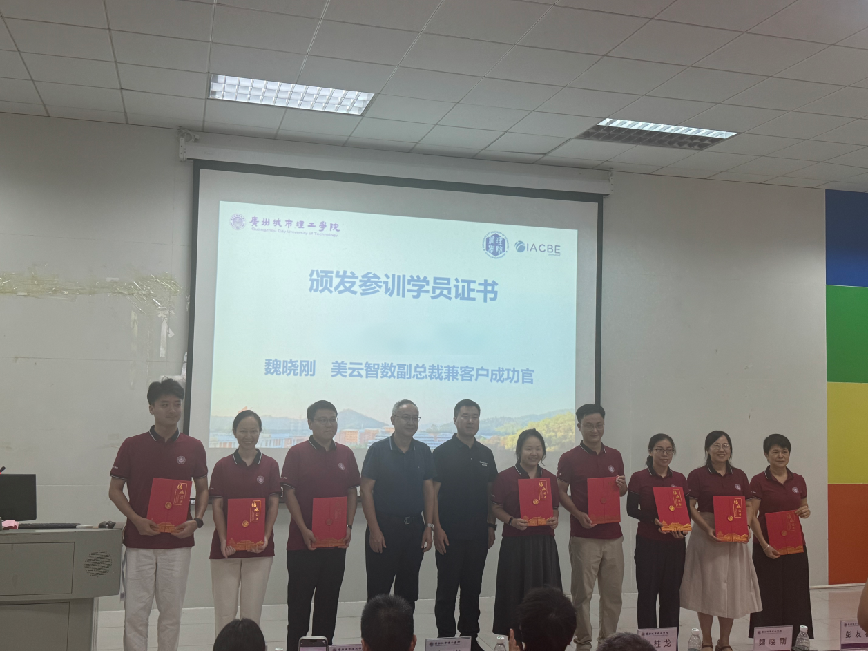 随后8位参训学员代表上台,由院长以及美云智数领导共同颁发结业证书。最后,管理学院院长进行总结发言。他充分肯定了研修班取得的成果,对参与培训的教师提出了在教学中运用数字化能力、推动学院数智化教学发展的期望。