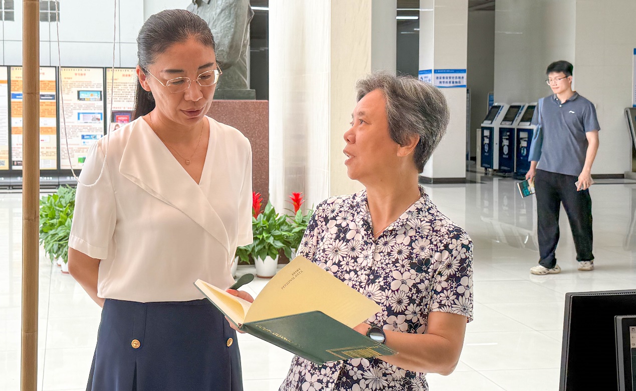 魏德敏首先来到一楼大厅,正值图书馆为庆祝教师节举办的“借阅有礼”活动火热进行之际。郭培虹向魏德敏详细汇报了活动情况:凡教师节当天到馆借阅的教职工,均可获得一份图书馆自主设计的文创产品,以此向辛勤耕耘的教师们致以节日的祝福与关怀。魏德敏对此次活动给予了高度评价,认为活动温馨且推动阅读,充分体现了图书馆的人文关怀。她仔细观看了文创礼品,并对文创礼品的设计理念、文化内涵和实用功能提出了意见。