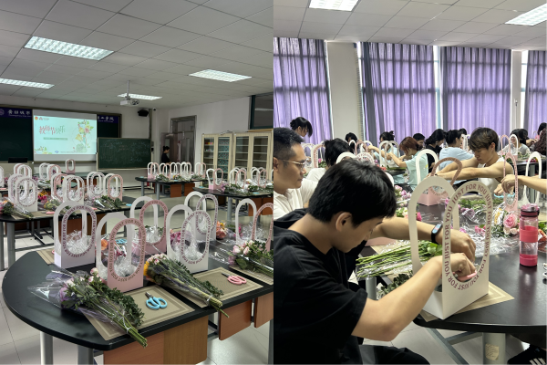 在插花环节,师生们围坐在一起,专注聆听专业插花老师关于花材选择、色彩搭配与造型设计的细致讲解。大家亲手修剪、巧妙搭配,将一朵朵玫瑰、康乃馨、洋桔梗幻化成一件件错落有致、生机盎然的花艺作品。这些满载祝福的花艺作品,由同学们亲手递到老师手中,成为师生情谊的最美见证。