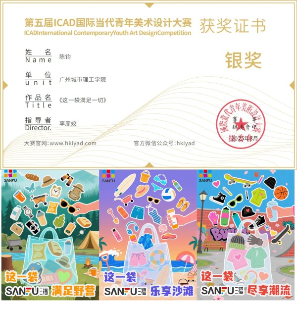 在本次大赛中,珠宝学院服装与服饰设计专业学生陈钧的作品荣获银奖。该作品以三福透明购物袋为视觉中心,巧妙地将品牌商品与多元生活场景相结合。购物袋中喷发出的各类物品构成充满动感与趣味的画面,生动传达了三福商品丰富多样、能满足不同生活需求的品牌内涵。作品凭借独特的创意构思、鲜明的色彩运用,精准传达出品牌年轻、时尚、充满活力的形象。