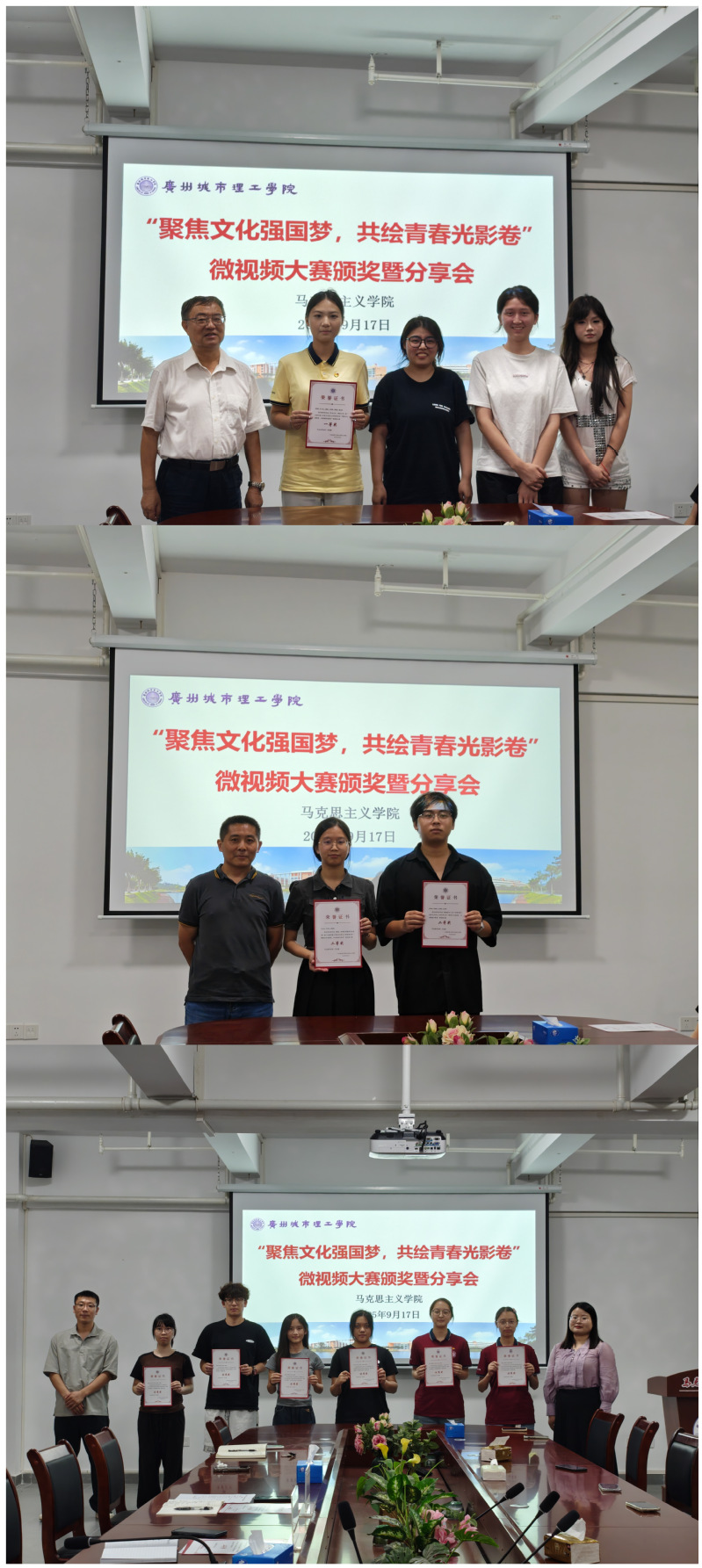 本网讯(记者 高健)为深入学习贯彻习近平文化思想,深化大学生对社会主义文化强国建设战略的理解与认同,落实立德树人根本任务,9月17日晚,马克思主义学院“聚焦文化强国梦,共绘青春光影卷”微视频大赛颁奖典礼在A12-802会议室举行。吕志院长、王文彦副院长、教师代表及获奖学生创作者齐聚一堂,共同见证光影里的青春答卷。